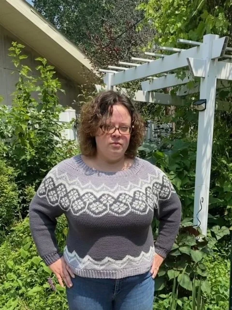Commuovere is a romantic garment, one that tells a story of life and love. A striking piece with tapestry motifs that evoke true emotions, it is worked top-down, mostly in rounds. Starting with a ribbed neckline, the yoke sports short rows at the back of the neck for a perfect fit. The whole garment is worked in central single crochet (waistcoat stitch) for a knitted look. After working the yoke, the body is separated from the sleeves and finished with another colorwork motif and a ribbed hem. The sleeves are then worked in the armhole openings in one main color and finished off with a ribbed cuff.